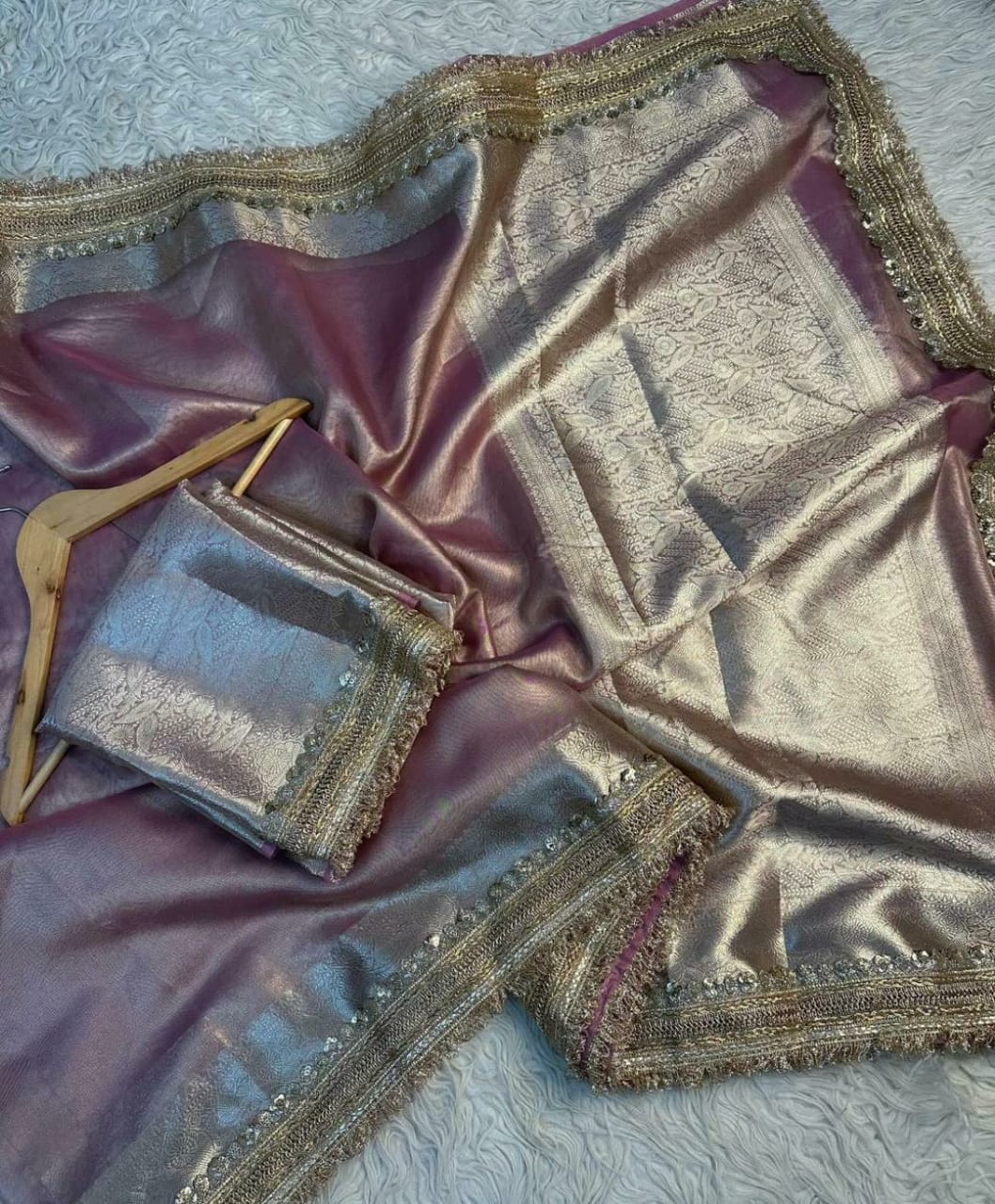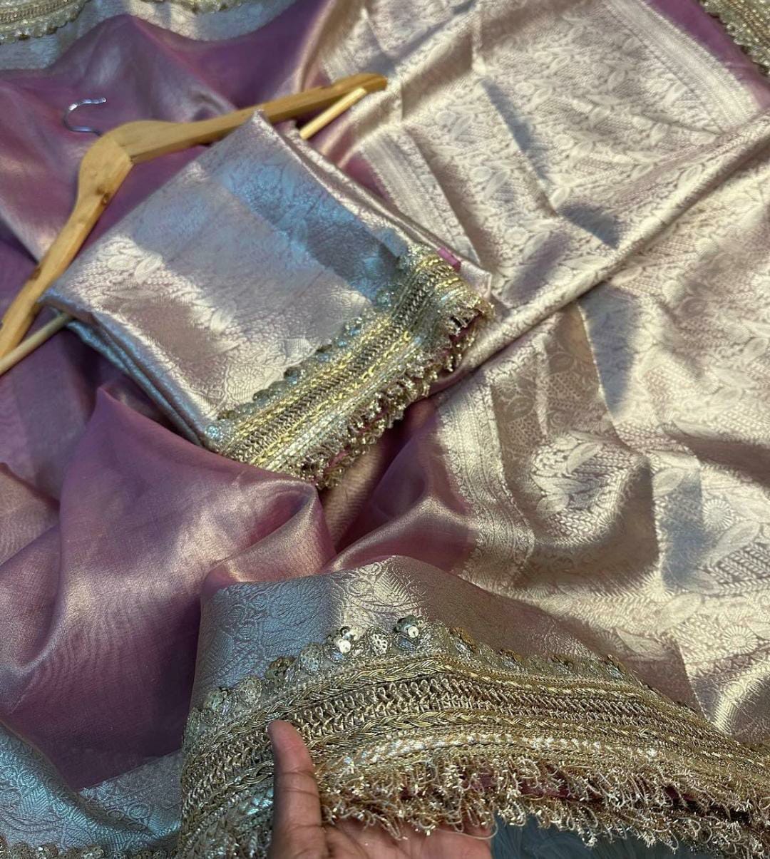 Fabric — Banarasi SOFT MAHARANI GLASS TISSUE SILK saree collection. All over beautiful broad lace work